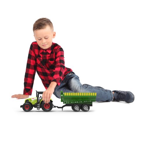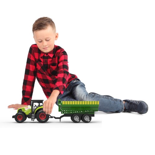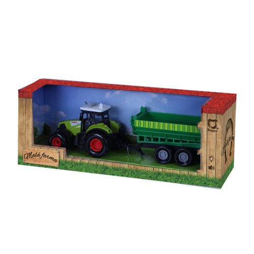 Moderný plastový traktor s vlečkou, hračka z kolekcie Moja malá farma. Nepostrádateľný pomocník pre každého malého farmára! Vlečku môžeš jednoducho odpojiť a traktor využiť na ďalšie práce. Traktor jazdí na zotrvačník a jeho dĺžka vrátane prívesu je 37 cm. Stlačením tlačidiel traktor vydáva reálne zvuky. Traktor vyžaduje 3 ks batérií typu AG13/LR44, ktoré sú súčasťou balenia.