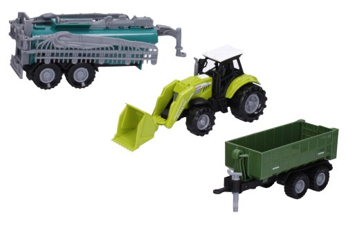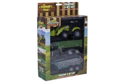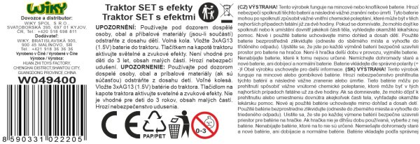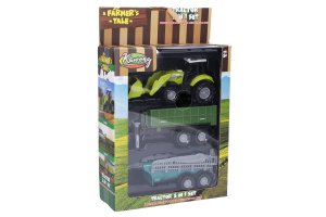 Traktor s príslušenstvom a efektmi. Veľkosť traktora 17 cm, vlečka 15 cm. Voľné kolesá. Svetelné a zvukové efekty tlačidlom na kapote. 3xAG13 batérie súčasťou.