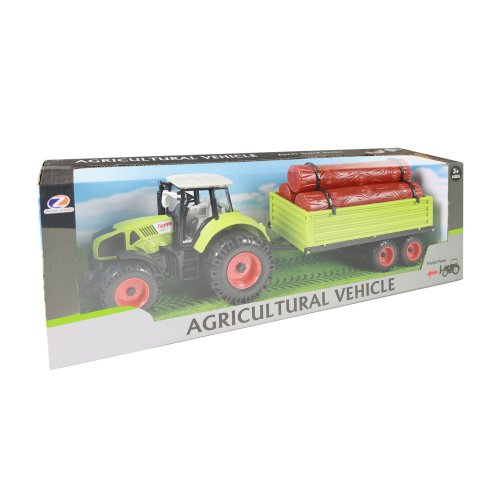 Moderný plastový farmársky traktor s vlečkou na drevo. Vlečka sa dá jednoducho odpojiť a klády zložiť. Traktor jazdí na zotrvačník a jeho dĺžka je 19 cm. Vlečka jazdí na voľný chod a je v dĺžke 22 cm. Celková dĺžka tejto súpravy je cca 45 cm.