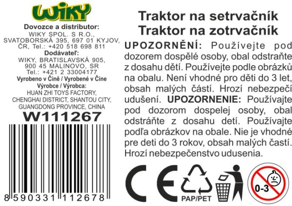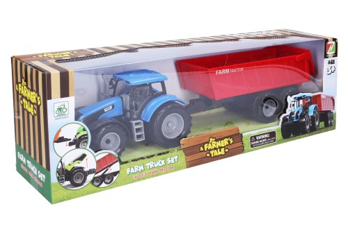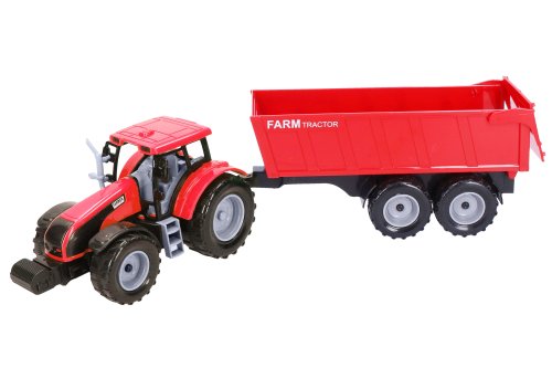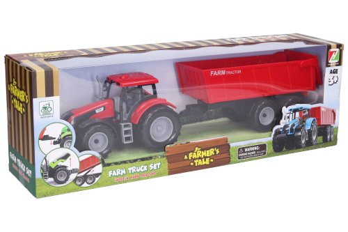 Traktor s vlečkou. Dĺžka 42 cm. Zadná časť vlečky je otváracia. Pohon na zotrvačník. 2 varianty - modrá, červená.