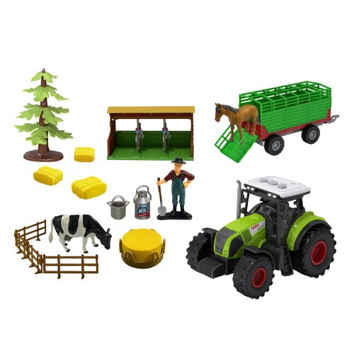 Veľký farmársky plastový traktor s vlečkou na seno a príslušenstvom. Tento set je dôležitým pomocníkom pre každého malého hospodára. Stlačením niektorého z tlačidiel na streche, traktor vydáva reálne zvuky a bliká. Funguje na 3 ks batérií typu AG13/LR44, ktoré sú súčasťou balenia.