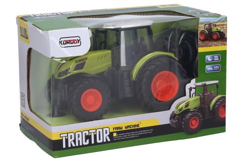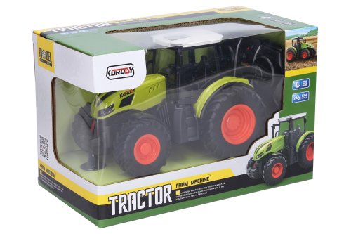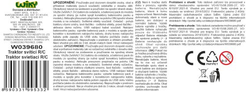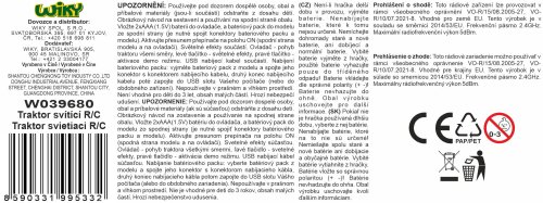 Traktor svietiaci RC na diaľkové ovládanie. Rozmery 20x10,5x12 cm. Frekvencia 2.4GHz. Svetelné efekty. 3.7V 500mAh batériový pack do traktora súčasťou, 2xAAA do ovládača nie sú súčasťou. USB kábel súčasťou. Prepínač ON/OFF na spodnej strane traktora a na ovládači. Ovládač - ľavé tlačidlo - svetelné efekty, pravé tlačidlo - demo režim. Obrázkový návod na používanie na spodnej strane obalu.