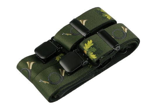 Traky s potlačou lesnej zveri potešia všetkých poľovníkov. Traky bývajú neoddeliteľnou a zároveň praktickou súčasťou ich oblečenia. Sú kvalitné českej výroby, elastický materiál umožňuje pohodlné nosenie. Zadná vsadka z eko kože im dodáva štýlový vzhľad. K nohaviciam sa upevňujú na tri žabky - dve vpredu a jednu vzadu.