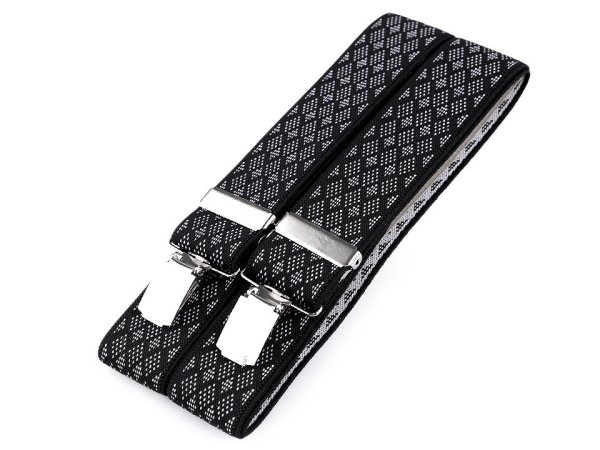 Pánske traky českej výroby s drobnými kosoštvorcami. Traky sú kvalitné, udržia vám nohavice na správnom mieste. Pokiaľ nie ste milovníci pásikov, „ traky“ sú pre vás ideálnym doplnkom. Elastický materiál umožňuje pohodlné nosenie. Zadná vsadka z eko kože im dodáva štýlový vzhľad. K nohaviciam sa upevňujú na tri kovové žabky - dve vpredu a jednu vzadu.