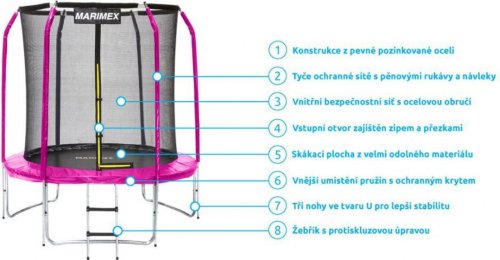 Skákacia trampolína Marimex je trampolína s vnútornou ochrannou sieťou. Pri skákaní sa teda neuhodíte o rámové oblúkové stĺpiky trampolíny, ktoré vďaka svojmu prehnutiu zväčšujú priestor medzi sieťou a stĺpikom samotným. Skákacia plocha trampolíny Marimex je z pevného materiálu s protišmykovou vrstvou a špeciálnou úpravou , vďaka ktorej si pri skákaní neodriete kožu na nohách.