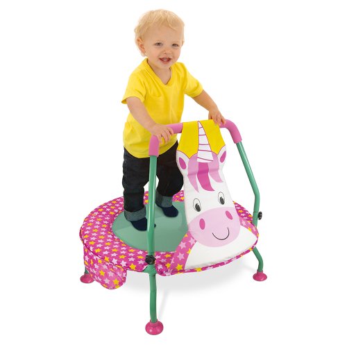 Doprajte deťom hodiny zábavy na tejto roztomilej trampolíne s kúzelným jednorožcom! Vďaka ľahko uchopiteľnej rukoväti, ktorú môžu deti držať pri skákaní, pomáha táto trampolína rozvíjať sebavedomie a povzbudzovať koordináciu a rovnováhu. Vhodné pre vnútorné aj vonkajšie použitie, s rúrkovým oceľovým rámom a odolnou povrchovou úpravou. Pre väčšiu bezpečnosť je vypolstrovaný rám okolo rohože a gumové nožičky chránia podlahu. Rukoväť a nohy sa odopínajú pre ľahké skladovanie. Rozmery: 60 cm od podlahy k rukoväti, rám s priemerom 70 cm.