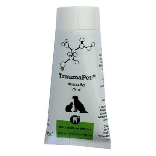 Zubná pasta s obsahom nanostriebra. TraumaPet stoma Ag zubná pasta je určená pre malé zvieratá, predovšetkým psy, na vykonávanie preventívnej hygieny ústnej dutiny a podporu liečby zápalov ústnej dutiny. TraumaPet stoma Ag je veterinárny prípravok na čistenie zubov s obsahom nanostriebra. Dlhoročné výskumy a konkrétne aplikácie preukázali antimikróbne a protizápalové účinky striebra. Zubná pasta pre psov má výborné abrazívne účinky na odstránenie povlaku. Jemná masová príchuť, ktorá urobí z čistenia zubov príjemný zážitok. Prostriedok nevykazuje toxické účinky. Zloženie: Aqua, Hydrated silica, Sorbitol, Glycerínum, Celulóza gúm, Aróma, Potassium sorbate, Stevia rebaudiana extrakt, Melaleuca alternifolia leaf oil, Argentum colloidale 50 µg/g. Spôsob použitia: Dentálnu hygienu u psov vykonávame pravidelne v jednodenných intervaloch zubnou kefkou s primeraným množstvom zubnej pasty. Zubnú kefku volíme vždy mäkkú, veľkostne zodpovedajúcu ošetrovanému jedincovi. Množstvo pasty je dané veľkosťou jedinca a nemá byť príliš veľké.