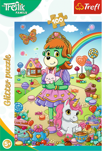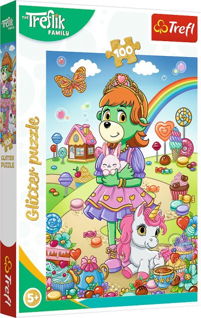 Trblietavé puzzle so 100 dielikmi s motívom postavičiek rodiny Treflíkov.