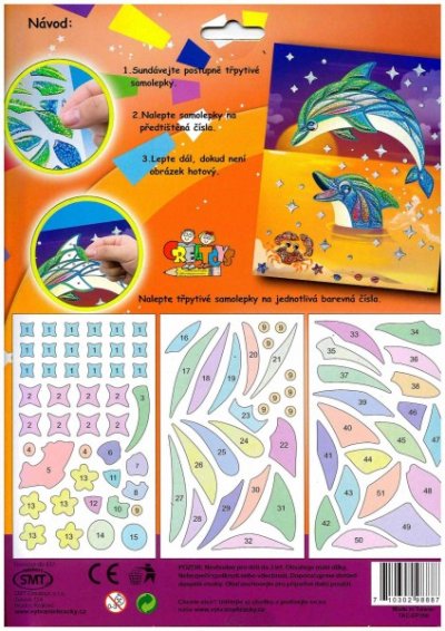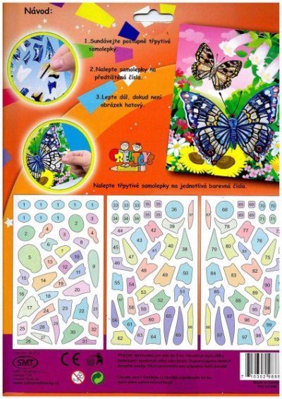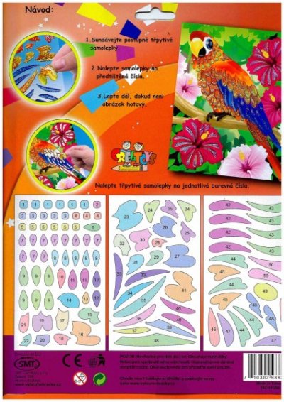 Na obrázok s natlačenými číslami nalepujete trblietavé samolepky. Vznikne nádherný farebný obrázok. Vhodné od 6 rokov. Veľkosť obrázku 25 x 20 cm.