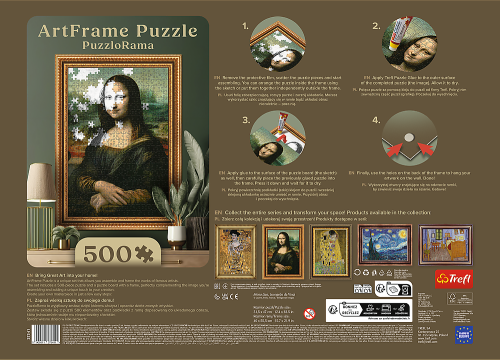 Nové vydanie puzzle inšpirované umeleckými majstrovskými dielami! Objav úplne nový rozmer skladania puzzle vďaka sérii PuzzloRama – nejde len o zábavu, ale aj o štýlovú dekoráciu tvojho interiéru! Každá sada obsahuje 500 dielikov, ktoré po zložení vytvoria krásnu reprodukciu jedného zo slávnych obrazov, zasadenú do elegantného rámčeka. V balení nájdeš: