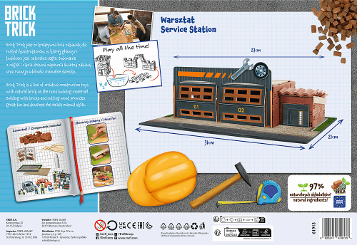 Postavte autoopravovňu zo skutočných tehál a dekoratívnych prvkov. S produktmi Brick Trick sa zoznámite s niektorými populárnymi a obľúbenými pamiatkami a hlavne získate možnosť postaviť si ich od základov. Skladajte tehlu za tehlou, režte a lepte dosky, postupujte od základov až po dokončenú budovu a nakoniec svoj výtvor ozdobte priloženými dekoráciami. Stavajte krok za krokom podľa návodu alebo nájdite a zrealizujte svoje vlastné riešenie. Pokiaľ spojíte niekoľko sád TREFL Brick Trick, môžete vytvoriť malebnú dedinku, moderné mesto alebo stredovekú osadu. Stavebnicu je možné používať opakovane (lepidlo je rozpustiteľné vodou). Balenie obsahuje: - viac ako 150 prírodných hlinených tehličiek - drevené dosky - základovú dosku - ozdobné prvky - samolepku - lepidlo - obrázkový návod Stavebnice Brick Trick od výrobcu TREFL zlepšujú zručnosť, rozvíjajú predstavivosť a podporujú sústredenie.
