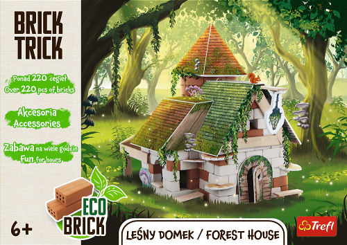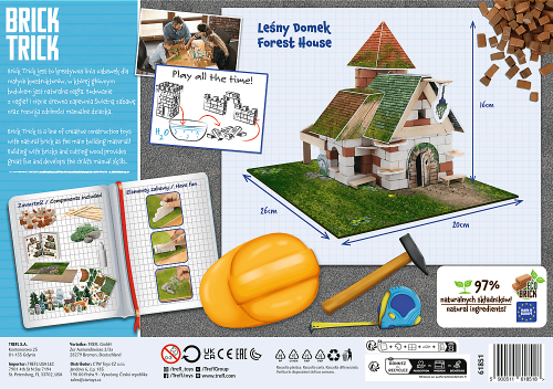 Postavte lesný domček zo skutočných tehál a dekoratívnych prvkov. S produktmi Brick Trick sa zoznámite s niektorými populárnymi a obľúbenými pamiatkami a hlavne získate možnosť postaviť si ich od základov. Skladajte tehlu za tehlou, režte a lepte dosky, postupujte od základov až po dokončenú budovu a nakoniec svoj výtvor ozdobte priloženými dekoráciami. Stavajte krok za krokom podľa návodu alebo nájdite a zrealizujte svoje vlastné riešenie. Oživte svoju dokončenú stavbu papierovými figúrkami. Pokiaľ spojíte niekoľko sád TREFL Brick Trick, môžete vytvoriť malebnú dedinku, moderné mesto alebo stredovekú osadu. Stavebnicu je možné používať opakovane (lepidlo je rozpustiteľné vodou). Úroveň obtiažnosti: 3,5 Balenie obsahuje: - viac ako 220 prírodných hlinených tehličiek - drevené dosky - základovú dosku - ozdobné prvky - samolepku - lepidlo - obrázkový návod Stavebnice Brick Trick od výrobcu TREFL zlepšujú zručnosť, rozvíjajú predstavivosť a podporujú sústredenie.