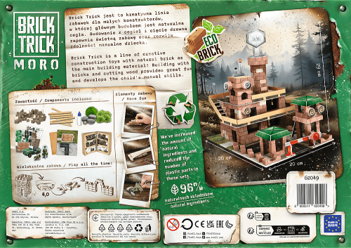 Staňte sa staviteľom a vybudujte zo skutočných hlinených tehál a dreva svoju vlastnú vojenskú základňu! Skladajte tehlu za tehlou, režte a lepte dosky, postupujte od základov až po dokončenú budovu a nakoniec svoj výtvor ozdobte priloženými dekoráciami. Stavajte krok za krokom podľa návodu alebo nájdite a zrealizujte svoje vlastné riešenie. Oživte svoju dokončenú stavbu papierovými figúrkami. Pokiaľ spojíte niekoľko sád TREFL Brick Trick, môžete vytvoriť malebnú dedinku, moderné mesto alebo stredovekú osadu. Stavebnicu je možné používať opakovane (lepidlo je rozpustiteľné vodou). Balenie obsahuje: - viac ako 340 prírodných hlinených tehličiek - drevené dosky - lepidlo - dekoračné doplnky - základovú dosku - obrázkový návod Stavebnice Brick Trick od výrobcu TREFL zlepšujú manuálne zručnosti, rozvíjajú predstavivosť a podporujú sústredenie. Vhodné pre deti od 6 rokov. Vyrobené v EÚ.