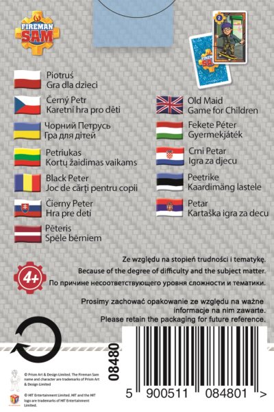 Detská kartová hra Čierny Peter s obrázkami z animovaného seriálu Požiarnik Sam. Všetkých 25 kariet sa rozdá zúčastneným hráčom tak, aby nebolo vidieť, kto Čierneho Petra dostal. Následne hráči odložia rovnaké dvojice kariet na stôl (podložku) a zvyšné karty si rozložia v ruke. Hráči si ponúkajú karty v kruhu a tvoria rovnaké dvojice. Prehrá ten, komu zostane v ruke Čierny Peter. Balenie: 25 kariet v papierovej krabičke