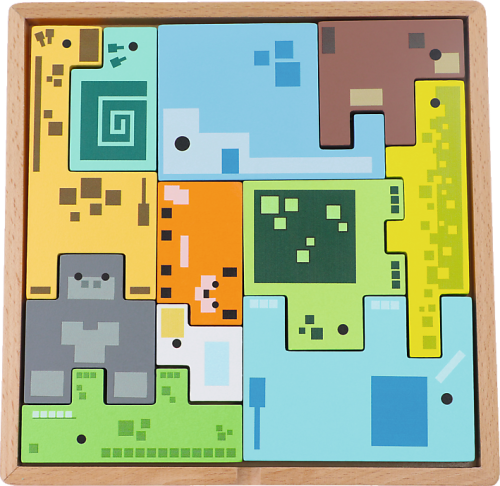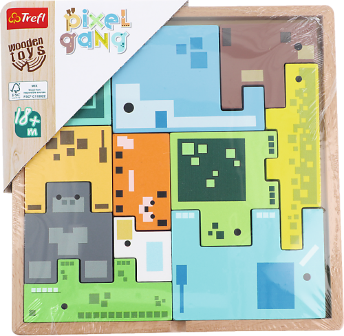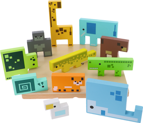 Drevená hlavolamová skladačka s dielikmi v tvare zvieratiek v modernom pixelovom dizajne. Pomenovávajte jednotlivé zvieratká a ukladajte ich podľa obrysov, kým nebudú všetky schované v krabičke.