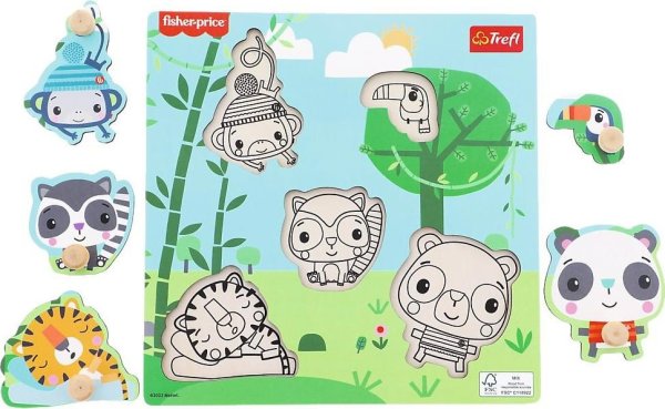 Vkladačka pre najmenších s obrázkami rozpustilých zvieratiek z džungle. Dieťa sa podľa obrysov a tvaru snaží nájsť správny obrázok (rozvoj predstavivosti a logického myslenia) a umiestniť ho do správneho otvoru (rozvoj jemnej motoriky). Vkladačka obsahuje päť dielikov s úchytkami a podkladové obrázky.