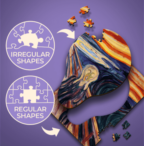 slávne umelecké diela vysoká kvalita a precízne spracovanie laserom časť dielikov je v klasickom puzzle tvare, časť je tvarovaná nepravidelne, 5 dielikov má špeciálne tvary súvisiace s obrazom puzzle je obojstranné - z jednej strany obrázok, z druhej strany vzor zadnú stranu puzzle so vzorom môžete ľubovoľne nafarbiť a vytvoriť tak vlastné umelecké dielo ekologické balenie - úplne bez plastových obalov, dieliky sú balené v papierovom sáčku