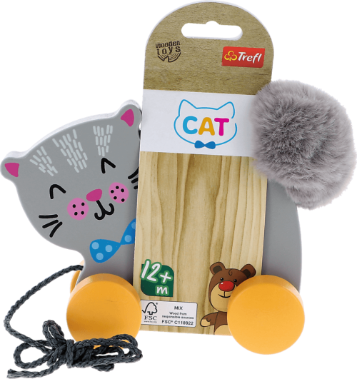 Šedé mačiatko na kolieskach pre najmenších od výrobcu Trefl z radu drevených hračiek, ktoré podporujú rozvoj dieťaťa.