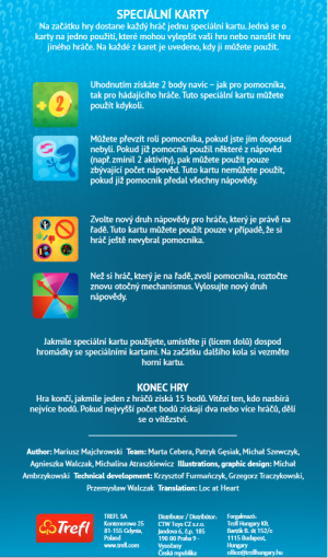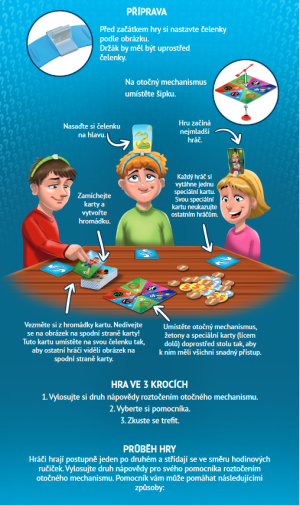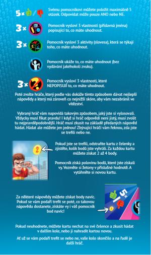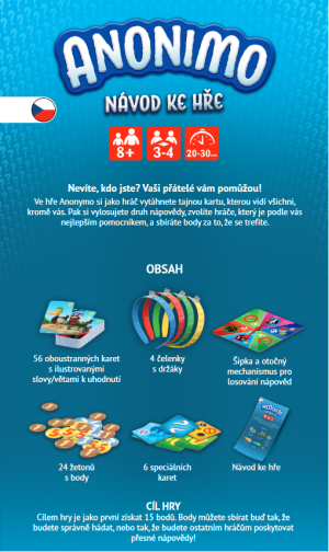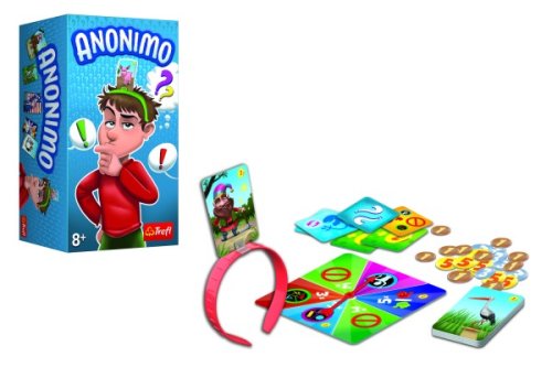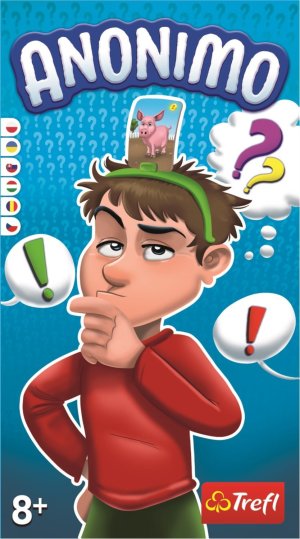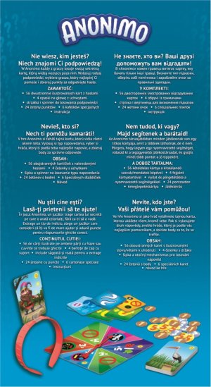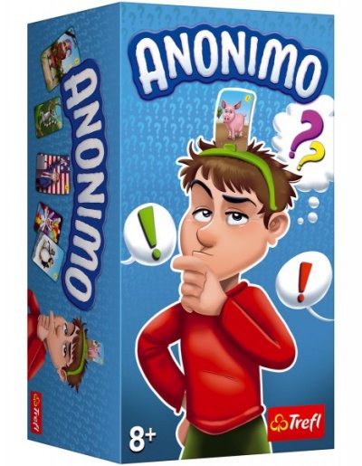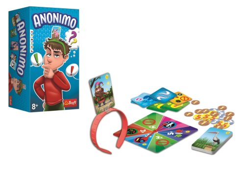 Neviete, kto ste? Vaši priatelia vám pomôžu! V hre Anonimo si ako hráč nasadíte čelenku, vytiahnete tajnú kartu, ktorú vidia všetci okrem vás. Potom si vyžrebujete druh pomocníka, zvolíte hráča, ktorý je podľa vás najlepším pomocníkom, a zbierate body za to, že sa trafíte. Hra obsahuje: 56 obojstranných kariet s ilustrovanými slovami/vetami na uhádnutie, 4 čelenky s držiakmi, šípka a otočný mechanizmus na žrebovanie pomocníkov, 24 žetónov s bodmi, 6 špeciálnych kariet, návod. Rozmer krabice: 14,5 x 26 x 10 cm Vhodné pre deti od 8 rokov