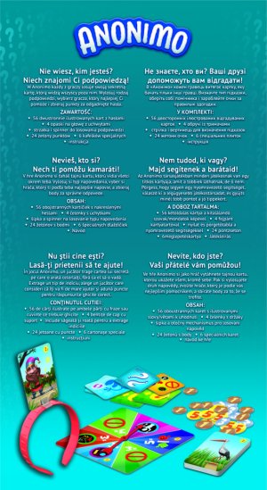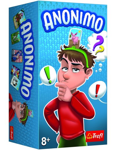 Neviete kto ste? Vaši priatelia vám pomôžu! Anonimo je spoločenská hra, pri ktorej musia hráči uhádnuť, kto alebo čo je na kartách. Najprv si ako hráč vytiahnete tajnú kartu, ktorú ukážete všetkým, okrem seba. Kartu upevníte do čelenky na vašej hlave. Potom si vyžrebujete druh pomocníka a zvolíte si hráča, o ktorom si myslíte, že bude vaším najlepším pomocníkom. Zbierate body za to, že sa trafíte. Obsahuje: 56 obojstranných kariet s ilustrovanými slovami alebo vetami na uhádnutie, 4 čelenky s držiakmi, šípku a otočný mechanizmus na žrebovanie pomocníkov, 24 žetónov s bodmi, 6 špeciálnych kariet, návod k hre. Vhodné pre hráčov od 8 rokov.