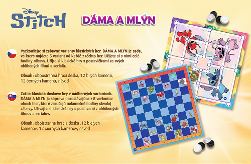Klasické hry Dáma a Mlyn v novom kabáte s obľúbenými hrdinami Lilo & Stitch! Dve obľúbené strategické hry v jednom balení – ideálne na trénovanie logiky, sústredenie a zábavu s rodinou i kamarátmi. Veselý dizajn s motívmi z rozprávky poteší všetkých fanúšikov tejto roztomilej dvojice. Obsah: obojstranná hracia doska, 12 bielych kameňov, 12 čiernych kameňov, návod k hre. Rozmer balenia: cca 29 × 19 × 4 cm Vhodné pre deti od 5 rokov