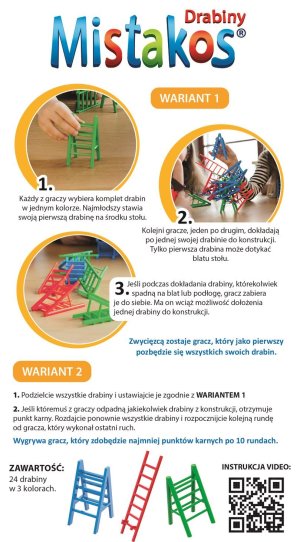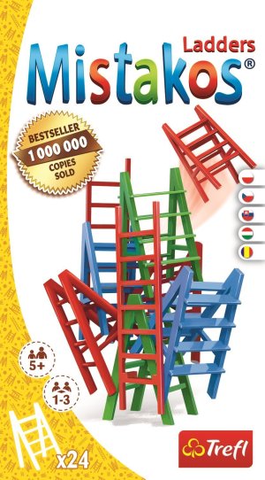 Zábavná hra s plastovými rebríkmi, ktorá skúša tvoju šikovnosť! Skvelá hra pobaví nielen teba, ale aj tvojich kamarátov alebo rodičov. S Mistakos sa nudiť nebudeš. Vyskúšaj svoje schopnosti a schopnosti. Koľko rebríkov sa ti podarí poskladať na seba, než sa pletenec rebríkov zrúti? Mistakos High Level je ideálna hra pre spoločné večery s rodinou alebo na párty. Hru je možné hrať tromi spôsobmi. Cieľom prvého variantu je dostať čo najmenej trestných bodov počas stohovania rebríkov. Najmladší hráč začína, vyberie si farbu rebríkov a položí jeden na stôt. Postupuje sa v smere hodinových ručičiek. Ďalší hráč si zvolí farbu a rebrík položí na ten predchádzajúceho hráča tak, aby sa nedotýkal stola. Rovnakým spôsobom pokračuje ďalší hráč. Pokiaľ skladaná veža spadne, kolo končí. Trestné body dostane ten, pri ktorého ťahu veža spadla. Počet trestných bodov sa rovná počtu spadnutých rebríkov. Ďalšie kolo pokračuje rovnakým spôsobom s tým, že začína hráč po ľavici toho, komu veža spadla. Víťazí hráč, ktorý má najmenej trestných bodov. Pri druhom variante je cieľom hry zbaviť sa rebríkov. Rozdeľte rebríky rovnomerne medzi všetkých hráčov. Hra spočíva v stavaní rebríkov na seba tak, aby ostatné rebríky nemohli spadnúť. Iba jeden rebrík môže stáť na stole. Hráč, ktorému rebríky spadnú, si ich vezme k sebe a hrá ďalší hráč. Pokračuje hráč naľavo. Víťazí ten, ktorý sa vbaví všetkých svojich rebríkov. Pri variante tri môžete spojiť základnú hru Mistakos (nie je súčasťou balenia) a Mistakos High Level a hrať súčasne pomocou rebríkov aj stoličiek (v rovnakej farbe pre jedného hráča). Pravidlá hry sú potom rovnaké ako pri prvom variante. Obsah balenia 24 rebríkov v troch farbách (8 zelených, 8 modrých a 8 červených). Odporúčané pre deti od 5 rokov.