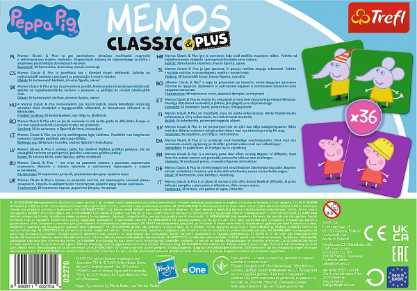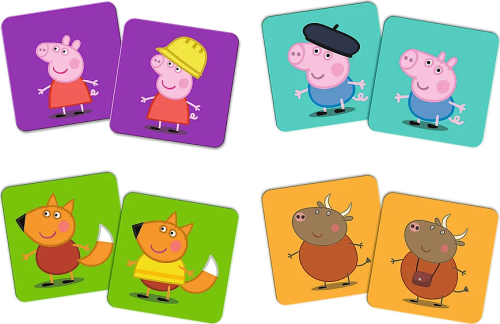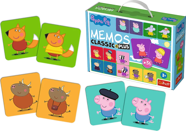 Štyri pamäťové hry s rôznymi stupňami obtiažnosti. Začnite od najjednoduchšieho variantu a prepracujte sa k novým výzvam. 4 varianty pexesa s postavičkami z animovaného seriálu Prasiatko Peppa, veľké kartónové kartičky, zábavné precvičenie pamäte a koncentrácie, balené v krabičke s uchom pre ľahké prenášanie Obsah balenia: 36 kartičiek, drevená figúrka, návod