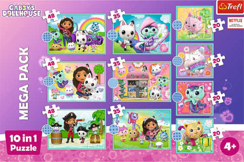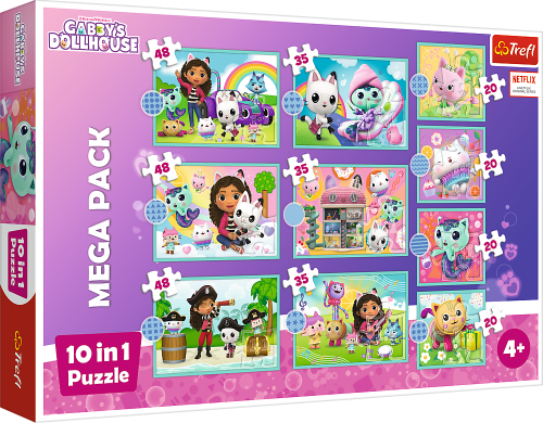 Mega Pack detských puzzle s motívom animovaného seriálu Gábinin kúzelný domček od výrobcu Trefl. Balenie obsahuje: štyri puzzle s 20 dielikmi, tri puzzle s 35 dielikmi a tri puzzle s 48 dielikmi. Vďaka rôznej potlači zo zadnej strany (kolieska, hviezdičky, srdiečka, ...), je možné jednotlivé obrázky od seba veľmi ľahko odlíšiť. Rozmer zloženého puzzle cca 4x (16,7 x 15,6 cm), 6x (22,3 x 15,6 cm)
