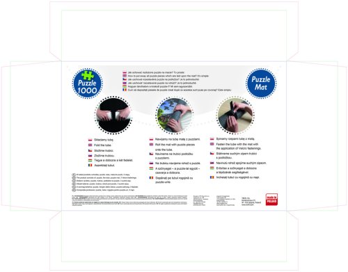 Súprava puzzle a rolovacie podložky - všetko, čo potrebujete pre pohodlné skladanie v jednej krabici. Podložka vhodná pre puzzle do veľkosti 85 x 58 cm (zodpovedá 1.500 dielikom väčšiny výrobcov). Koberček na puzzle je ideálny na úsporu miesta a bezpečné uchovanie nedokončeného aj hotového obrázku. Podložka zaistí bezpečné uchovanie alebo transport vášho puzzle. Skladá sa z pevných kartónových tubusov s priemerom 7,5 cm, ktoré spojíte k sebe, šedej filcovej podložky o rozmere cca 95x65 cm a pásikov so suchým zipsom na pevné uchytenie. Na šedom koberčeku sú vyznačené obrysy pre puzzle TREFL o veľkosti panoramatickej 500, 500, 1000, a 1500 dielikov. UPOZORNENIE: V prípade zakúpenia koberčeka na skladanie puzzle iných značiek odporúčame overiť rozmery zloženého puzzle. Údržba filcovej podložky: Podložku je možné žehliť na najnižšiu teplotu najlepšie cez tenkú tkaninu (utierku). Ručné pranie v studenej vode, nežmýkať a nesušiť v sušičke. Rozmer zloženého puzzle cca 68,3 x 48 cm