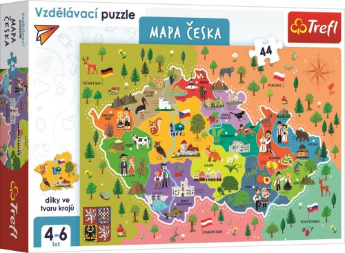 Vzdelávacie puzzle pre deti s mapou Slovenska s dielikmi v tvare krajov. Na mape sú uvedené názvy českých miest spolu so stavbami a vecami charakterizujúcimi jednotlivé časti krajiny. Všetky popisy na mape sú uvedené v slovenskom jazyku. Skladanie farebných dielikov rozvíja u detí postreh, zručnosť a sústredivosť. Obrázky predstavujúce zvieratá, rastliny či budovy navyše stimulujú u najmenších detí predstavivosť a pomáhajú im spoznávať najodľahlejšie zákutia planéty. Odporúčané pre deti od 4 rokov. Rozmer zloženého puzzle cca 60 x 40 cm