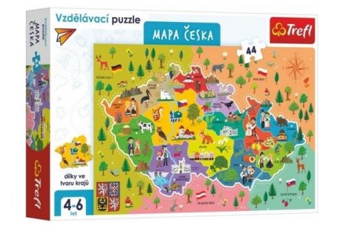 Vzdelávacie puzzle mapa Českej republiky 44 dielikov 60 × 40cm Vzdelávacie puzzle - Mapa Česka sú skvelou príležitosťou, ako ukázať malým objaviteľom krásy tejto krajiny. Vďaka farebným dielikom v tvare krajov sa deti zoznámia s administratívnym delením Českej republiky. Viete, kde sa nachádza najstarší most v Česku? Kde si môžete pochutnať na olomouckých syrečkách a zúčastniť sa konských dostihov? Odpoveď na tieto a ďalšie otázky nájdete po zložení puzzle. Vďaka vlajkám v rámčeku sa navyše zoznámite aj so susedmi Českej republiky. Učte sa a hrajte sa s našimi puzzle. Veľkosť zloženého obrázku: 60 × 40 cm Dieliky v tvare krajov. Obsahuje 44 dielikov. Vek: 4+