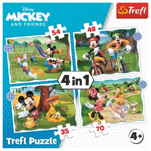 Detské puzzle TREFL s motívmi z animovaných príbehov o myšiaku Miskeym a jeho kamarátoch. Progresívne puzzle s rôznou obtiažnosťou - 4 puzzle s 35 - 70 dielikmi.