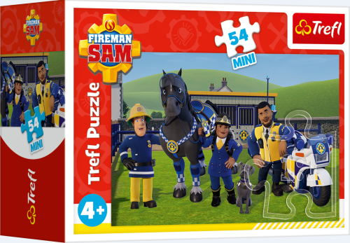 Mini-Puzzle (dieliky 2,2 cm, balené v malej krabičke) zo série Požiarnik Sam. Rozmer zloženého puzzle cca 20 x 13 cm