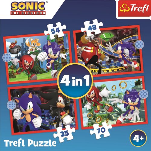 Detské puzzle TREFL s motívom animovaného filmu Sonic. Progresívne puzzle s rôznou obtiažnosťou - 4 puzzle s 35 - 70 dielikmi. Rozmer zloženého puzzle cca 28,5 x 20,5 cm
