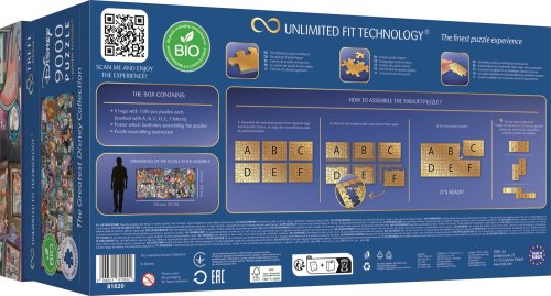 Poskladajte si obrovské puzzle s ikonickými postavami z rozprávkového sveta Disney. Každý obrázok je balený samostatne (6x1500 dielikov). Vďaka technológii TREFL Unlimited Fit Technology (UFT), ktorá umožňuje spojenie jednotlivých obrázkov medzi sebou, môžete vytvoriť ľubovoľnú kompozíciu obrázkov alebo sa držať rozmiestnenia podľa predlohy.