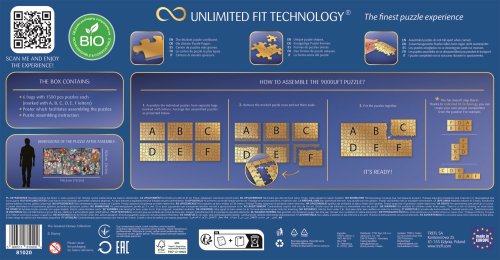 Najvyššia kvalita – puzzle je vyrobené z najsilnejšieho modrého kartónového podkladu. Unikátna technológia UFT umožňuje vytvorenie vlastnej kompozície. Puzzle dieliky držia pri sebe - poskladané obrázky je možné pohodlne premiestňovať bez toho, aby sa zložený motív rozsypal. Bio balenie - bez vrchnej plastovej fólie. Vnútorné vrecko je úplne biologicky rozložiteľné a kompostovateľné. Puzzle je balené v šiestich samostatných vreckách po 1500 dielikoch. Súčasťou balenia je aj papierová predloha o rozmere 67x45cm.