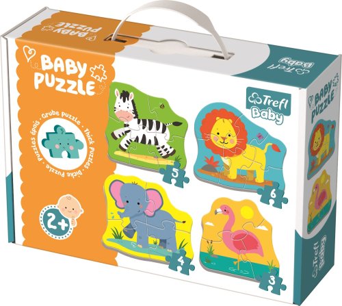 Štyri veľké puzzle pre najmenšie deti so zebrou, levom, slonom a plameniakom. Veľké dieliky s hrúbkou 4mm sú pre malé detské ručičky ľahko uchopiteľné a prvé skladanie rozvíja manuálnu zručnosť, koordináciu aj priestorovú orientáciu.
