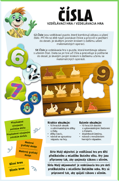 Čísla sú vzdelávacie puzzle, ktoré kombinujú zábavu a učenie číslic. Pri hre sa dieťa naučí poznávať číslice a súčasne si precvičuje počítanie do desať. Hra je skvelým prvým krokom k ďalšiemu učeniu matematických operácií. Balenie obsahuje: