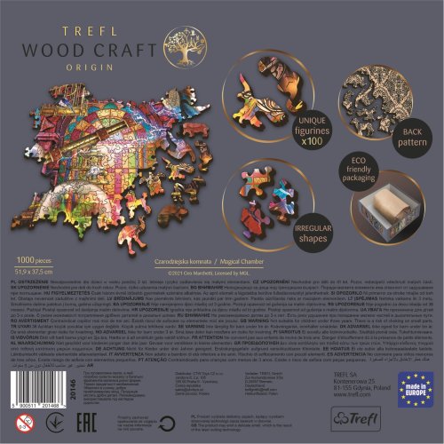 Drevené obojstranné puzzle TREFL z prémiového radu Wood Craft Origin so špeciálne tvarovanými dielikmi v tvare slávnych budov, dopravných prostriedkov alebo napríklad zvierat. Puzzle je vyrobené zo silnej drevovláknitej dosky a vyrezané laserom, vďaka čomu sú okraje hladké a dieliky do seba ľahko zapadajú. - vysoká kvalita a precízne spracovanie laserom - 100 unikátne tvarovaných dielikov v tvare budov, predmetov a zvierat - ostatné dieliky v nepravidelných tvaroch - puzzle je obojstranné - z jednej strany obrázok, z druhej strany vzor - ekologické balenie - úplne bez plastových obalov Súčasťou balenia je predloha skladaného motívu.