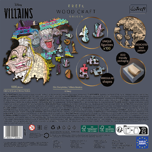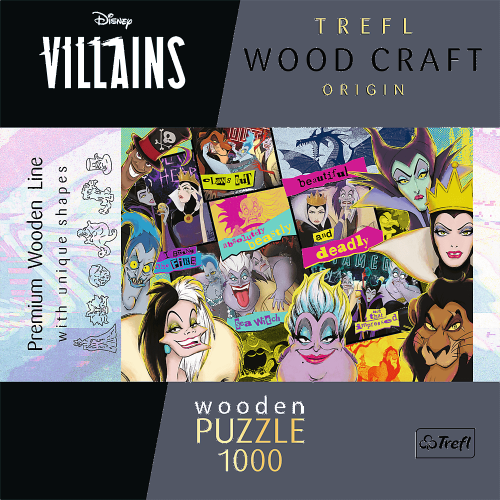 Drevené obojstranné puzzle TREFL z prémiového radu Wood Craft Origin so špeciálne tvarovanými dielikmi, ktoré sú inšpirované svetom Disney. Puzzle je vyrobené zo silnej drevovláknitej dosky a vyrezané laserom, vďaka čomu sú okraje hladké a dieliky do seba ľahko zapadajú.
