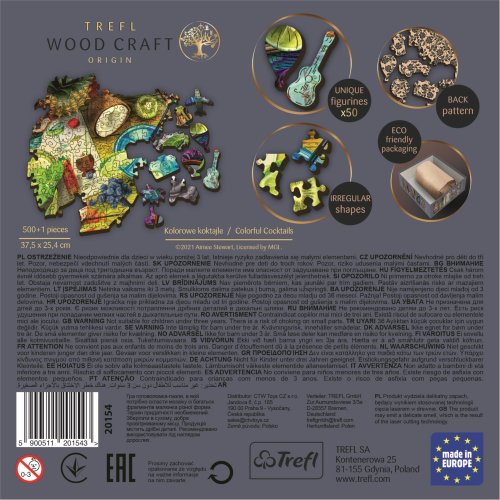 Drevené obojstranné puzzle TREFL z prémiového radu Wood Craft Origin so špeciálne tvarovanými dielikmi v tvare slávnych budov, dopravných prostriedkov alebo napríklad zvierat. Puzzle je vyrobené zo silnej drevovláknitej dosky a vyrezané laserom, vďaka čomu sú okraje hladké a dieliky do seba ľahko zapadajú.
