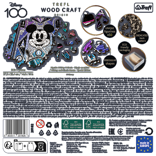 Drevené obojstranné puzzle TREFL z prémiového radu Wood Craft Origin so špeciálne tvarovanými dielikmi v tvare slávnych budov, dopravných prostriedkov alebo napríklad zvierat. Puzzle je vyrobené zo silnej drevovláknitej dosky a vyrezané laserom, vďaka čomu sú okraje hladké a dieliky do seba ľahko zapadajú.