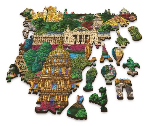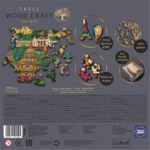 Drevené obojstranné puzzle TREFL z prémiového radu Wood Craft Origin so špeciálne tvarovanými dielikmi v tvare slávnych budov, dopravných prostriedkov alebo napríklad zvierat. Puzzle je vyrobené zo silnej drevovláknitej dosky a vyrezané laserom, vďaka čomu sú okraje hladké a dieliky do seba ľahko zapadajú.