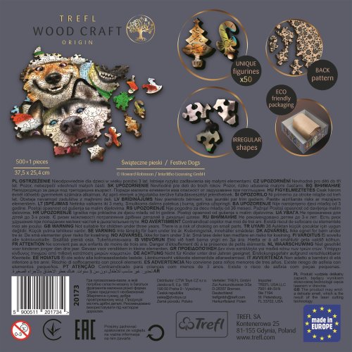 Drevené obojstranné puzzle TREFL z prémiového radu Wood Craft Origin so špeciálne tvarovanými dielikmi, ktoré sú inšpirované Vianocami. Puzzle je vyrobené zo silnej drevovláknitej dosky a vyrezané laserom, vďaka čomu sú okraje hladké a dieliky do seba ľahko zapadajú.