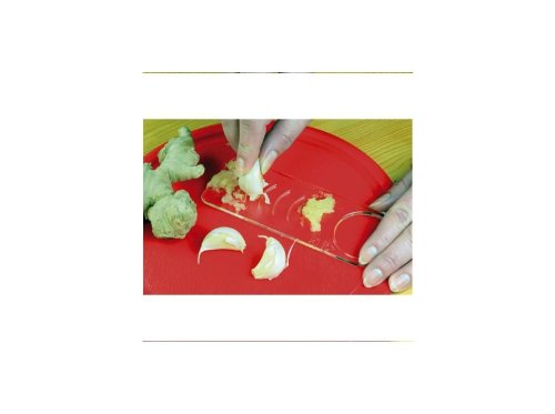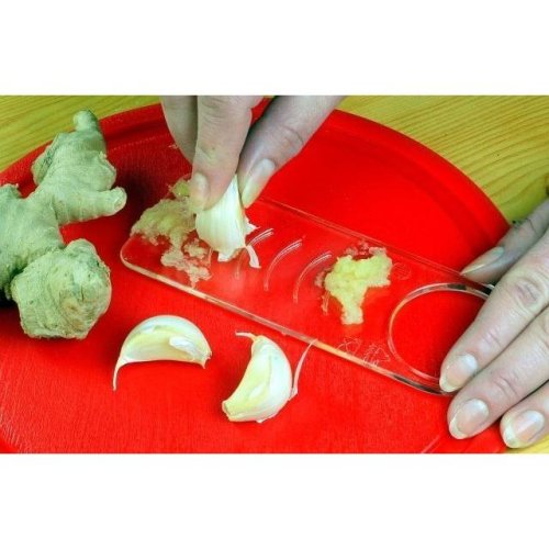 Obojstranné transparentné plastové trojtko na cesnak. Rozmery 15 x 5.5 cm. Český výrobca. 1. Strúčik cesnaku nelúpte. Nožom odrežte stopkovú časť (krček). Podržte za korienok a miernym tlakom cez krúžky trietka cesnak rozotierajte. Šupka, ktorá zostáva sa roztvára pozdĺž prstov, ale cesnaková kašička (pasta) zostáva na doštičke trojtka. Vzniknutú jemnú kašičku (pastu) môžete použiť na potretie plátkov mäsa, rýb, hrianok a spolu s nivou pripravíte aj výbornú nátierku na jednohubky. 2. Strúčik cesnaku aj so šupkou vložte na chvíľu do studenej vody. Nožom odrežte stopkovú časť (krček). Podržte za korienok a takto cesnak rozotierajte. Šupka, ktorá zostáva sa roztvára pozdĺž prstov, ale cesnaková kašička (pasta) zostáva na trietku a pretože je vlhká, nezanecháva stopy šupky. EAN 8594011951083