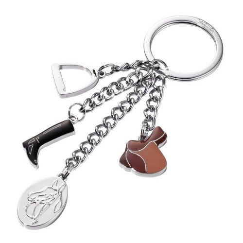 Kľúčenka so 4 príveskami - strmeň, jazdecká topánka, sedlo a doštička s koňom. Kombinácia striebornej, čiernej a odtieňov hnedej. Rozmery: 110 x 95 x 35 mm hmotnosť: 56 g motív koní - hlava koňa, strmeň, jazdecké topánky, sedlo vhodná aj ako darček
