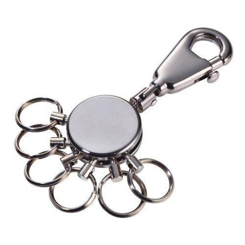 Guľatá kľúčenka v tvare karabínky as 6 kusmi odnímateľných krúžkov, vďaka ktorým máte organizáciu kľúčov stále pod kontrolou. Strieborné prevedenie.<br> <br> • rozmery: 90 x 25 x 9 mm<br> • hmotnosť: 48 g<br> • karabínka s 6 ks odnímateľných krúžkov<br> • vhodná aj ako darček<br> • ľahká organizácia kľúčov tzv. Key Organiser