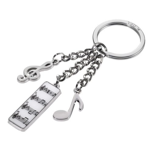 Kľúčenka s 3 príveskami - nota, husľový kľúč, notový zoštit. Kombinácia bielej, čiernej a striebornej farby.<br> ; <br> • rozmery: 115 x 35 x 11 mm<br> • hmotnosť: 25 g<br> • motív husľového kľúča, nového zošita a nôt<br> • vhodná aj ako darček