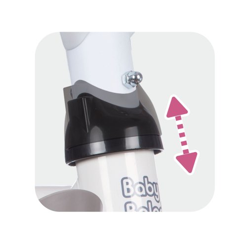 Kovový rám, tiché kolieska, riadiaca tyč s taškou, strieška proti slniečku, opierka hlavy, ochranný rám, brzda, klaksón, opierky nôh.
