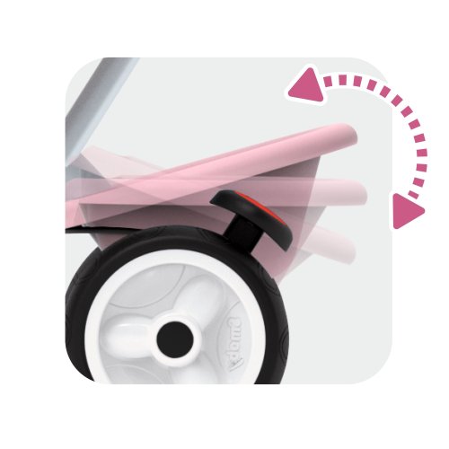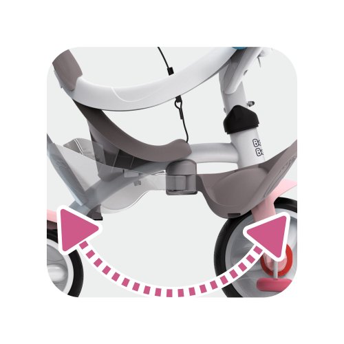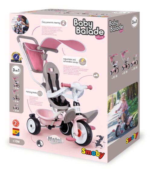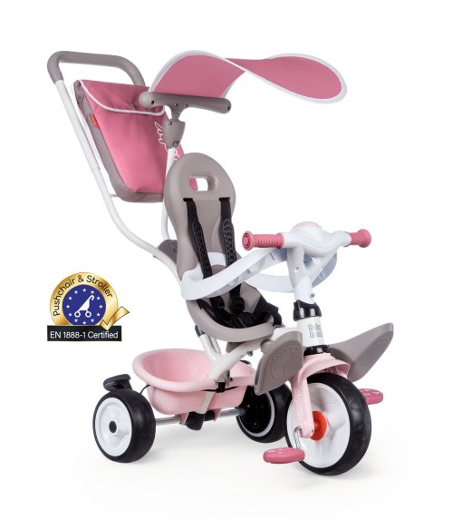 Kovový rám, tiché kolieska, riadiaca tyč s taškou, strieška proti slniečku, opierka hlavy, ochranný rám, brzda, klaksón, opierky nôh. Certifikované EN 1888-1 pre kočíky. Rozmery: 68x101x52 cm.